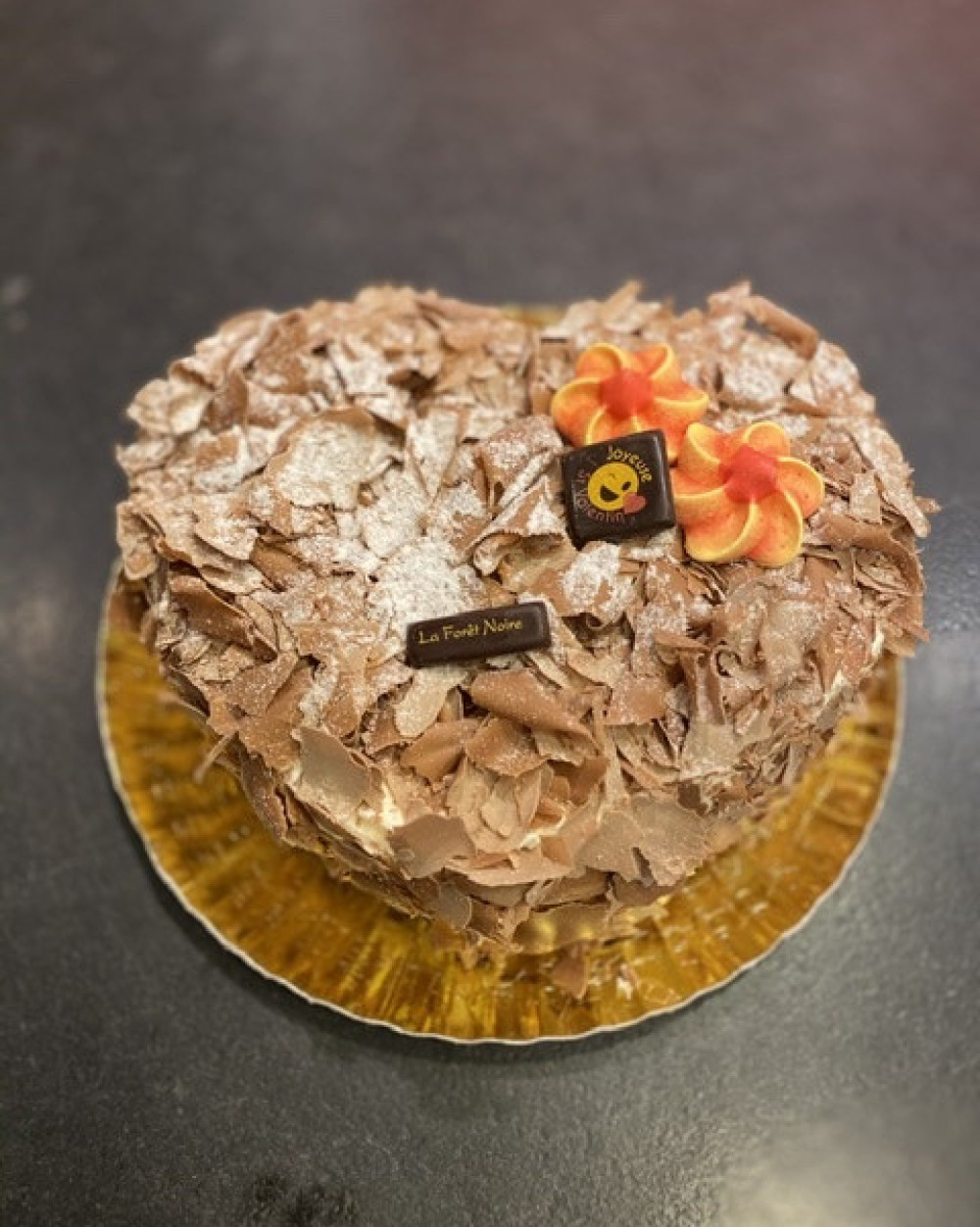 Pâte sablée aux amandes garnie d'une crème mousseline au chocolat noir, compotée de griottes, kirsch, génoise cacao, chantilly et copeaux de chocolat lait + décor St Valentin
