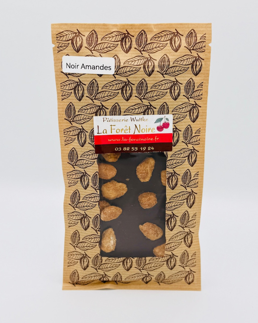 Couverture au chocolat noir 70%, amandes torrefiées.