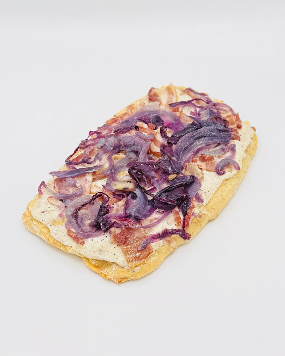 Pâte à pain à l'huile d'olive, crème de fromage blanc, lardons fumés, oignons rouge .