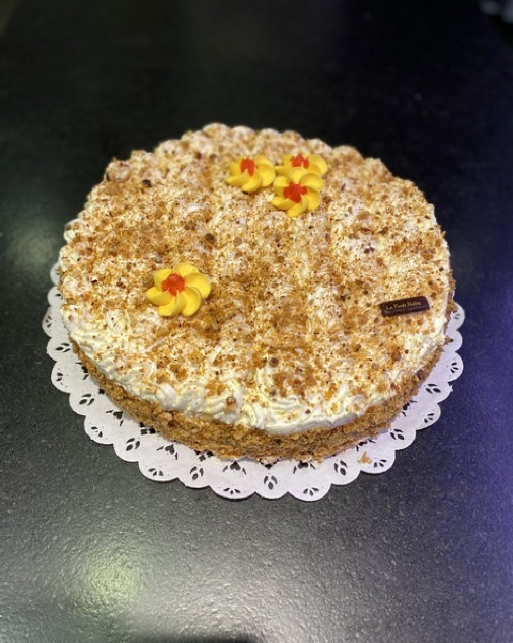 Fond de pâte feuilletée recouvert de crème patissière et de pralin amandes et noisettes, génoise aux oeufs frais, chantilly.